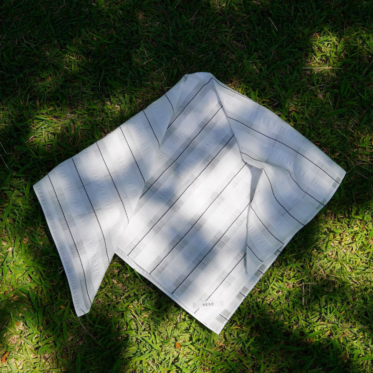 白をグレーを基調としたストライプ柄にネイビーのステッチワークが特徴的なスクエア型の「スカーフ」