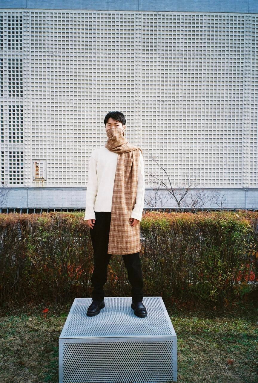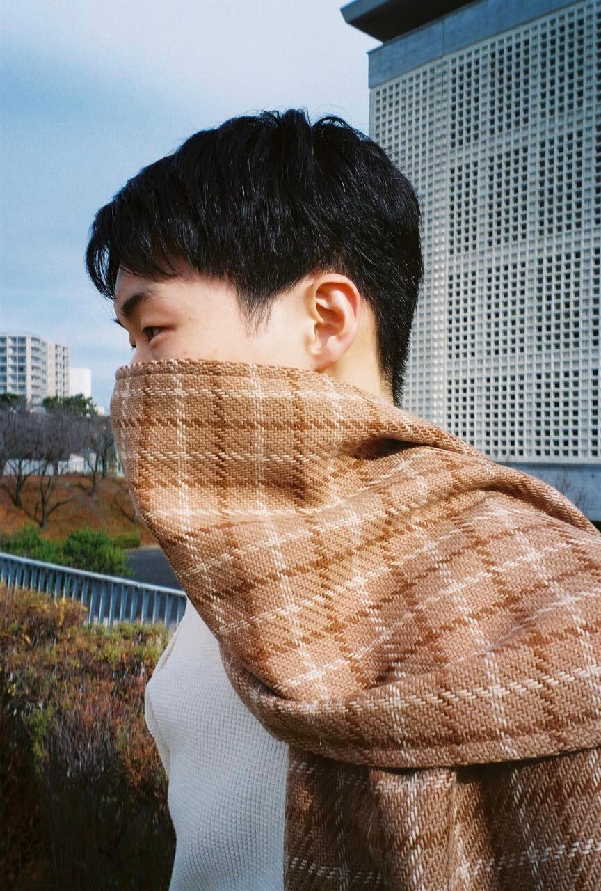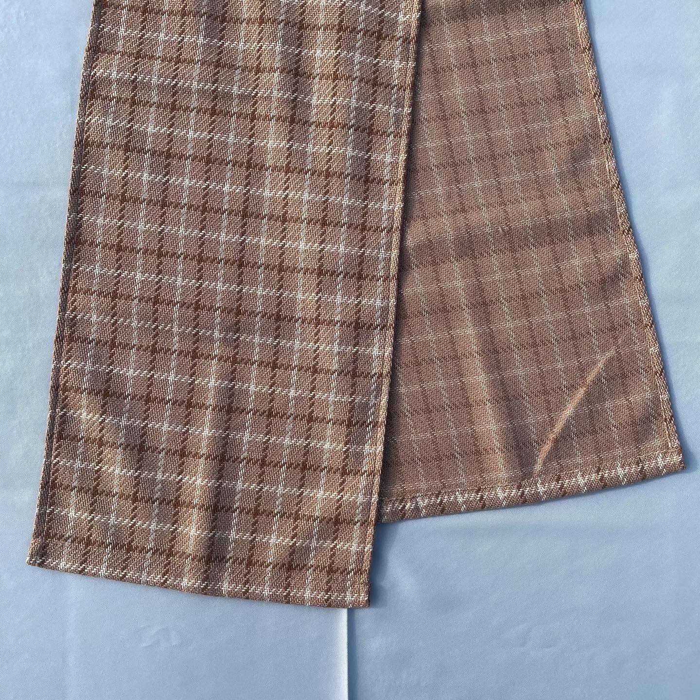 ブラウン、ホワイトの色糸でチェック柄を構成させた大判の「ストール」